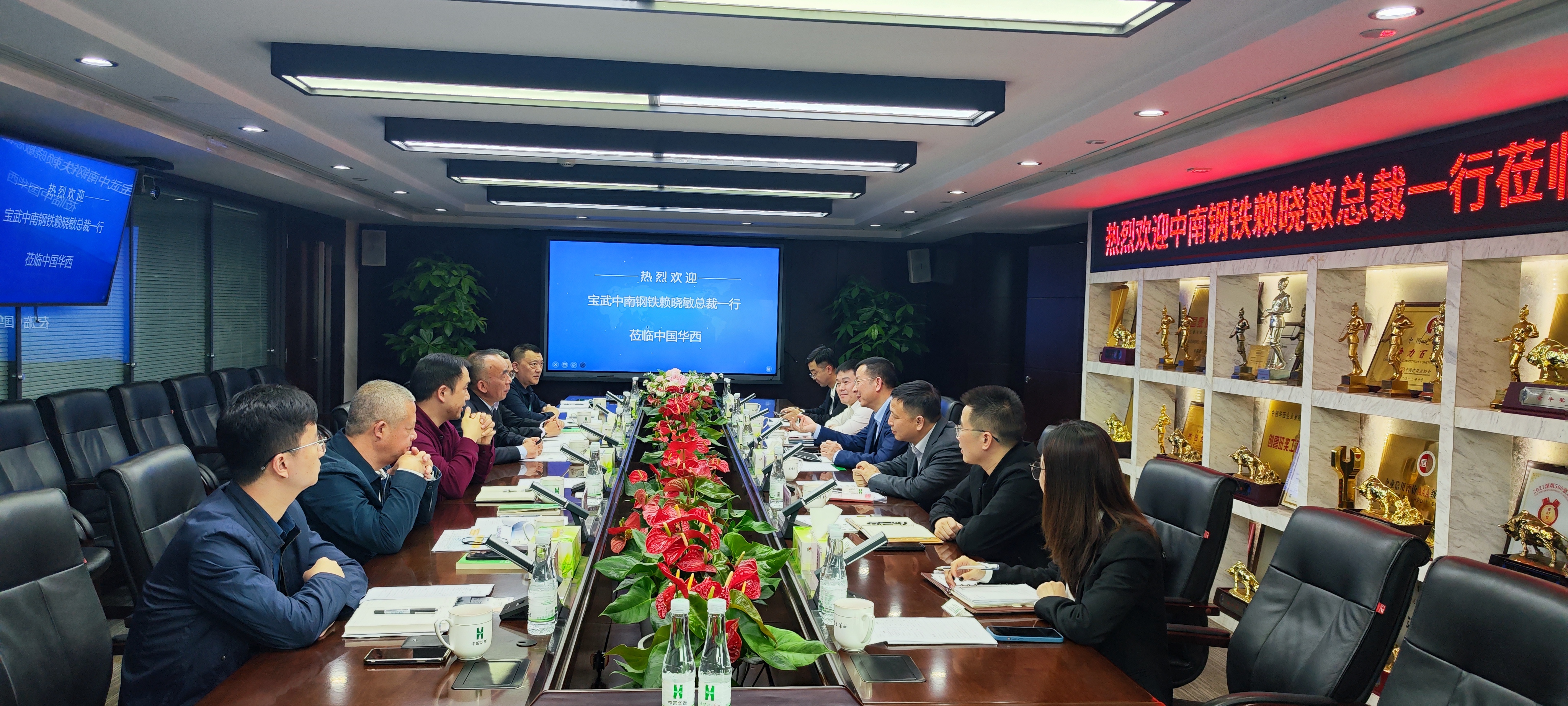 中集同创总经理刘斌热烈欢迎赖晓敏一行的到来,并表示与赖总在鄂钢就是老朋友了,希望双方能碰撞出更多的火花。他介绍了中集同创的经营情况和规划,以及目前与宝武体系的合作情况,中集同创与中南股份同属于华南地区,充分发挥双方集团公司的战略合作优势,希望在社会钢铁贸易、钢材加工、废钢等业务进一步探索。